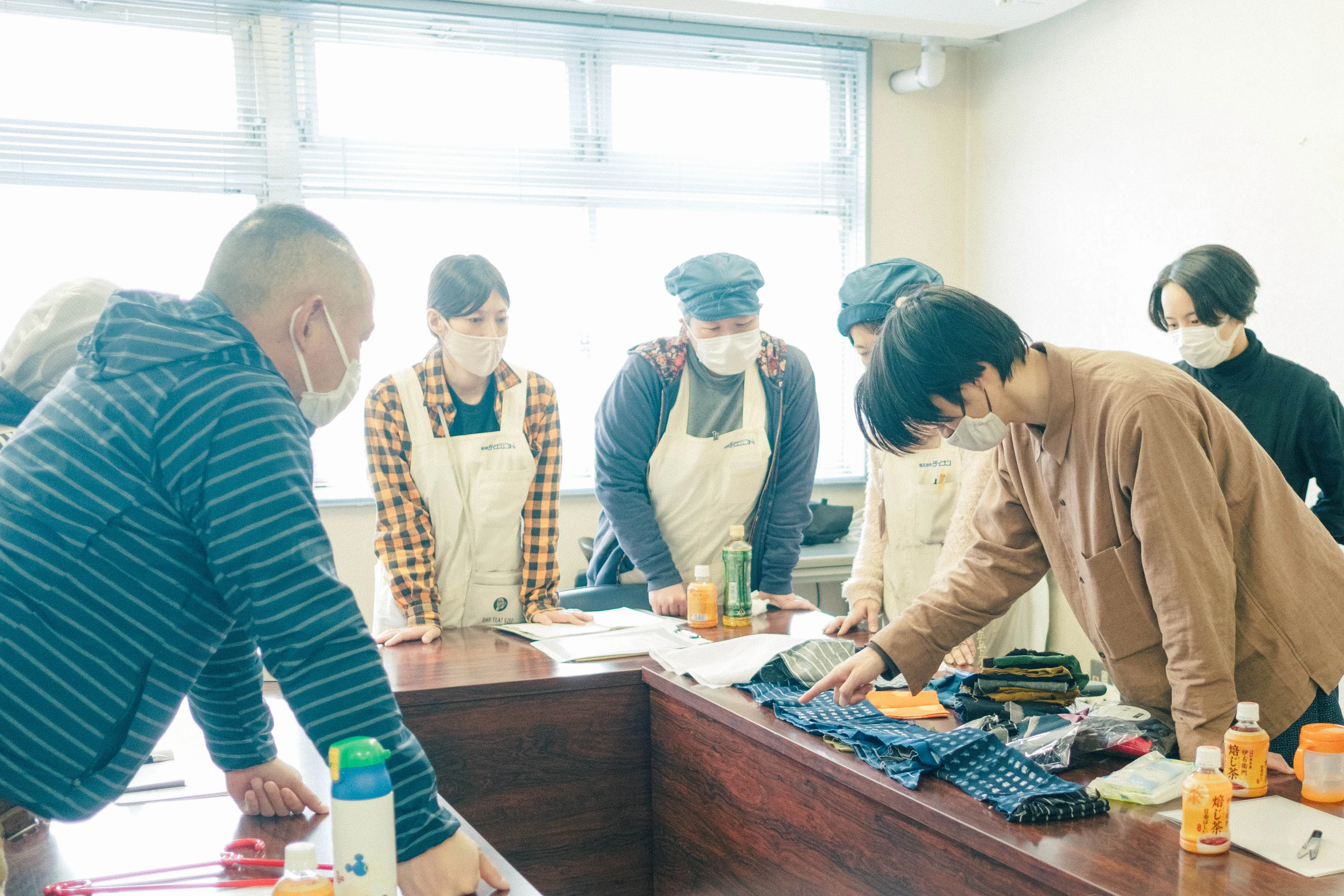 このプロジェクトは「ユニフォームのデザイン」が依頼内容でしたが、ものづくりのプロセスを実践を通して経験することをもう一つの大きなテーマとして大切にしました。「縫製」という繊維製品の最終工程を担っている会社ですが、生地を作ったり、デザインを生み出したり、他の工程を学ぶことが、やはり縫製にとってもよい影響をもたらすと考えたからです。開発チームと一緒に久留米絣の工場を見学したり、デザインをどのように発想して形にしていくのか。そんなことを逐一共有しながらプロジェクトを進めて行くことになりました。