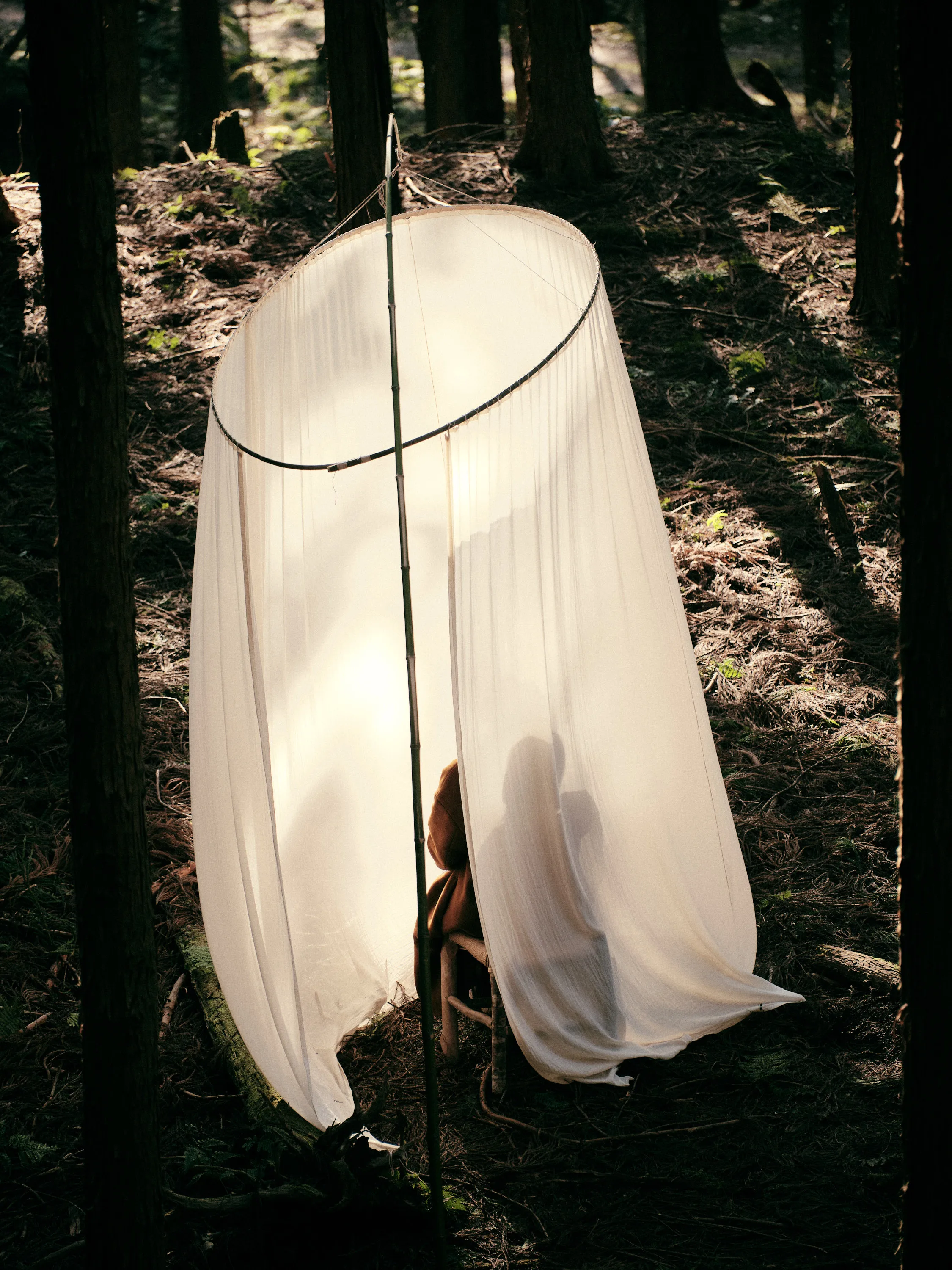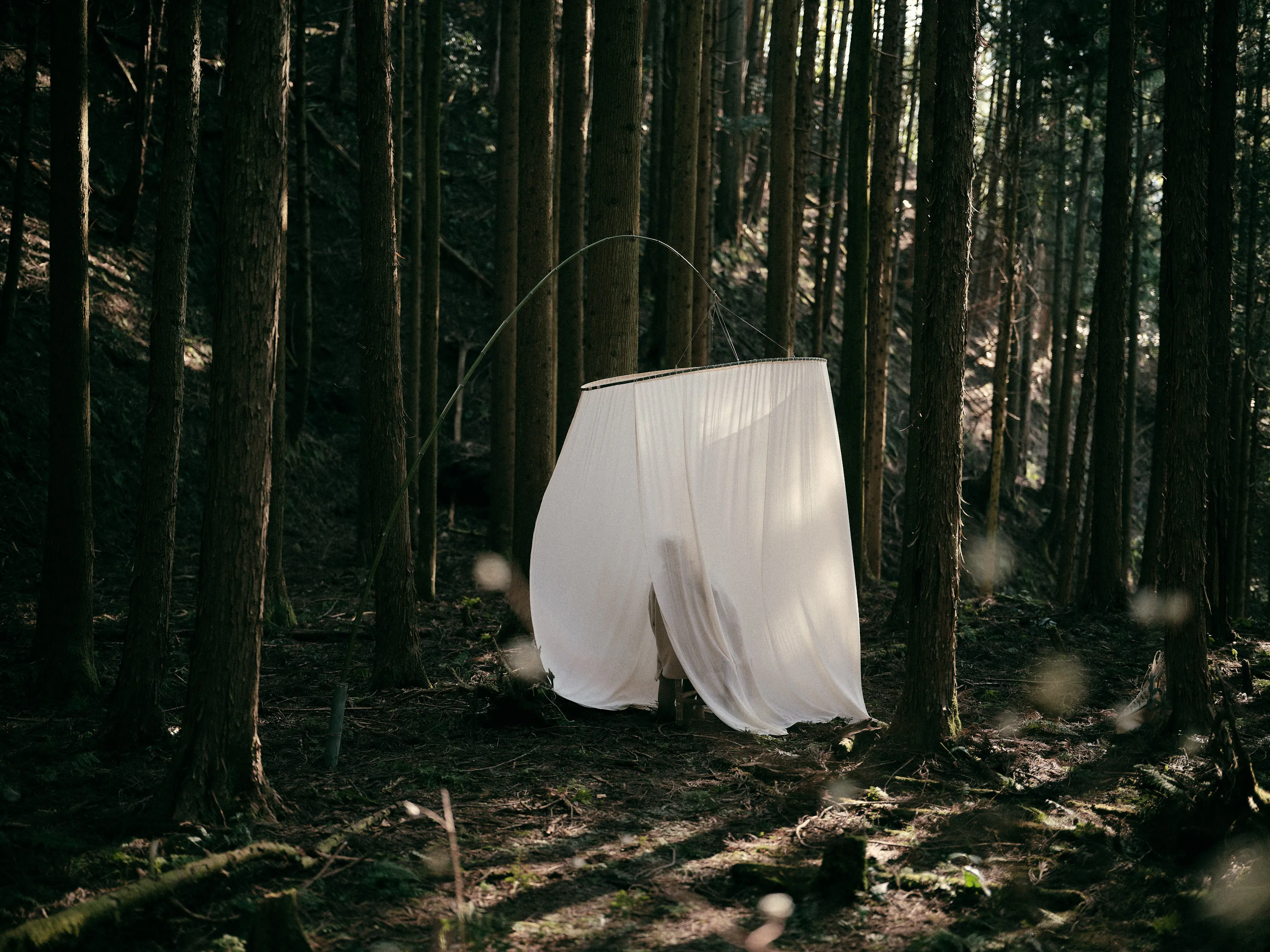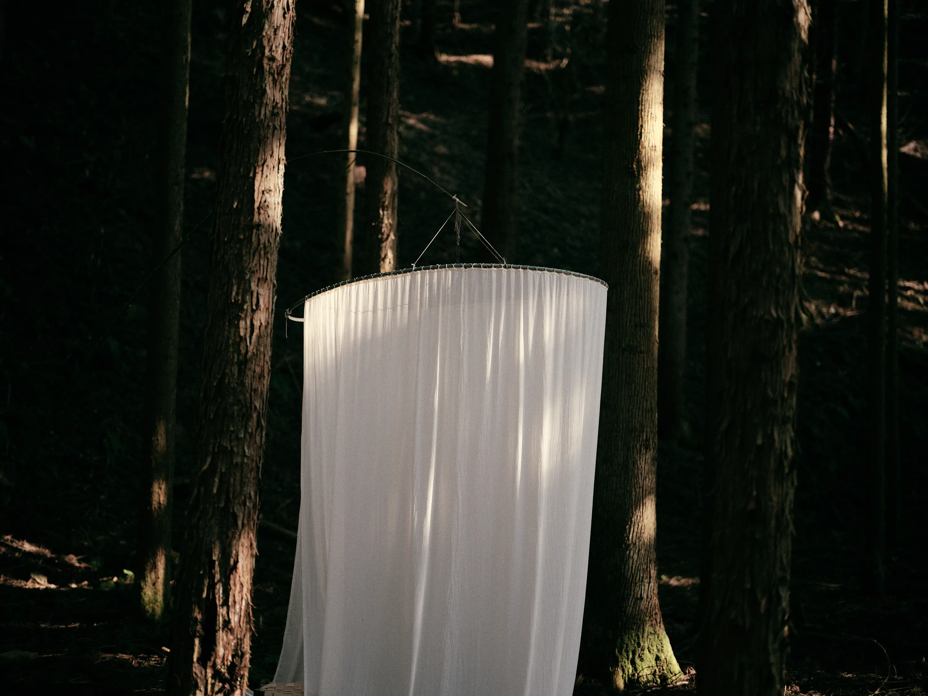 僕は森に入ると、自分の中から、普段は意識していない不思議な感覚が立ち上がって来るような気がしています。それはすっかり飼い慣らされてしまった僕の中の野生なのかもしれません。布を通して「見えないものを見えるようにする」そんなことをいつも考えてデザインをしています。森の展示室では、「みえないことで、みることができる」という逆の発想からアイデアを展開しました。