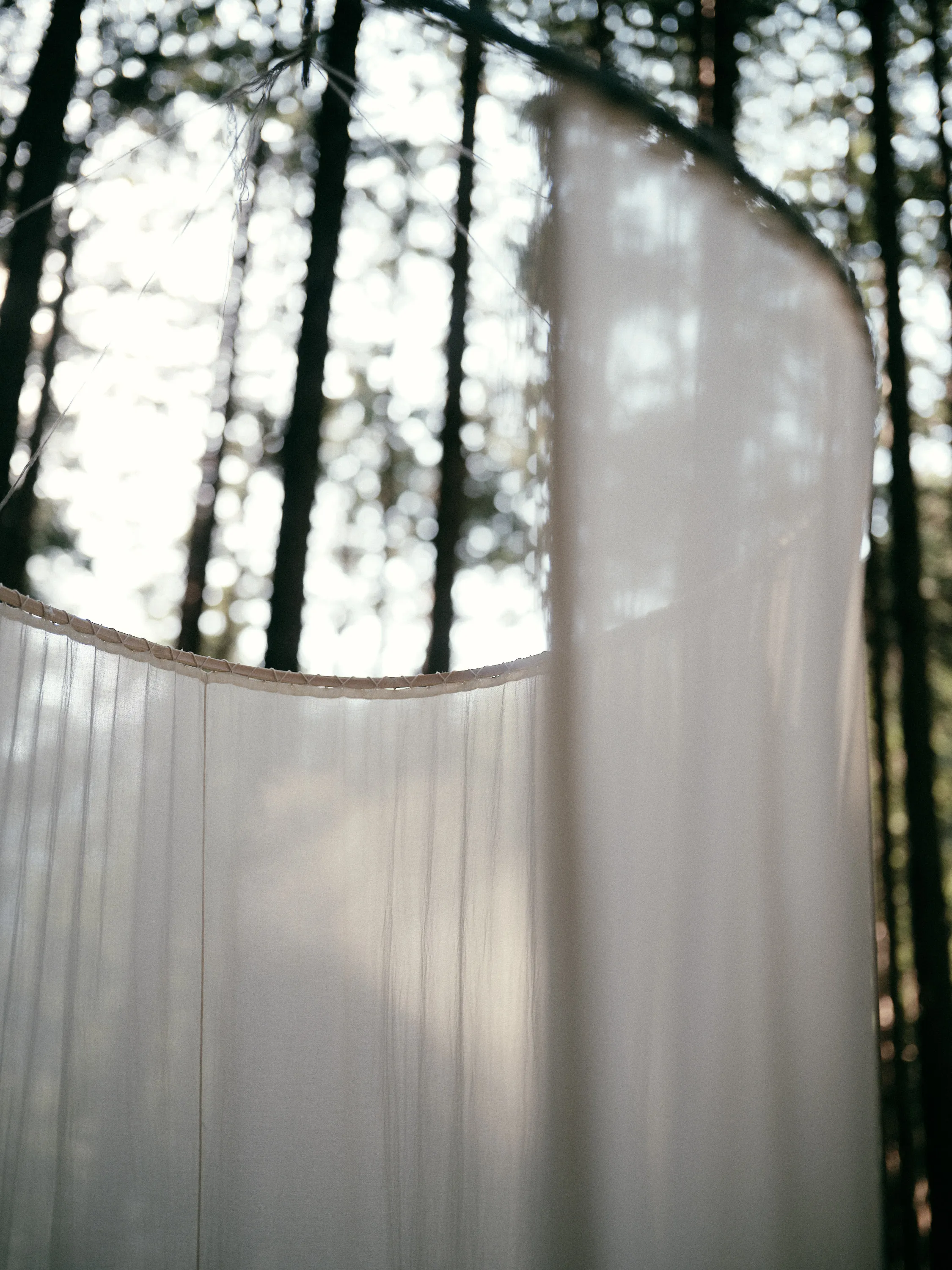 布の中に入ると、視覚のほとんどが遮られます。向こう側がほのかに透ける程度の軽い布ですが、景色の大半は見えなくなります。すると、普段は奥に控えていた感覚が立ち上がってきます。木の葉のざわめき、川の流れる音、鳥の声。湿った土の匂い。風が布を揺らす触感。どれも最初からそこにあったものです。